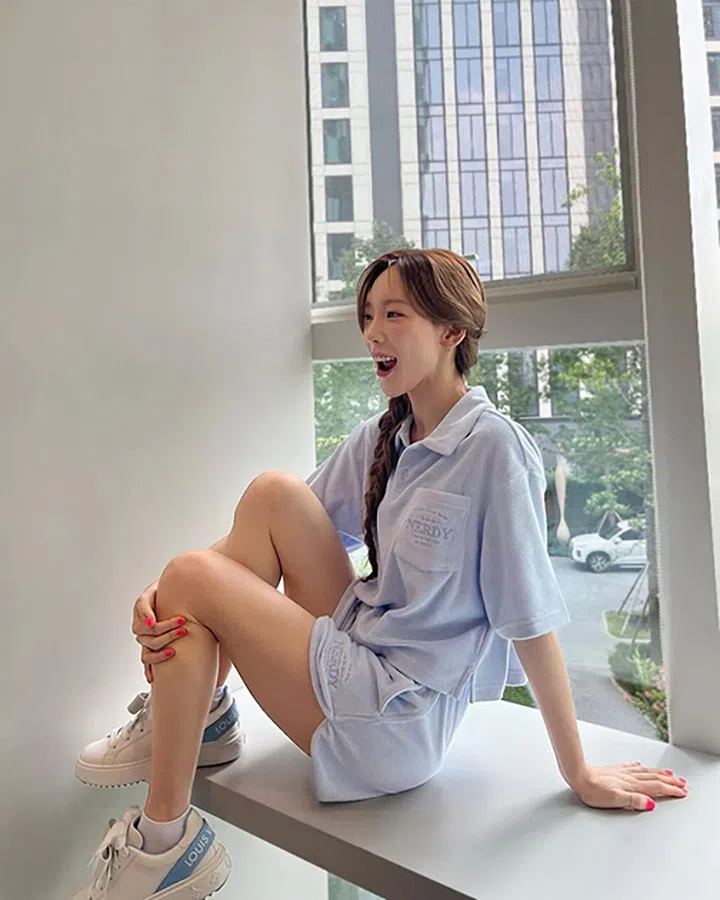 作为韩国时装品牌Nerdy的代言人,泰妍身穿品牌奶蓝色的上衣+短裤套装,再配上Louis Vuitton的球鞋。毛巾布料的衣服舒适感满满,也将泰妍衬托得更加温柔可人,就像邻家女孩一样~