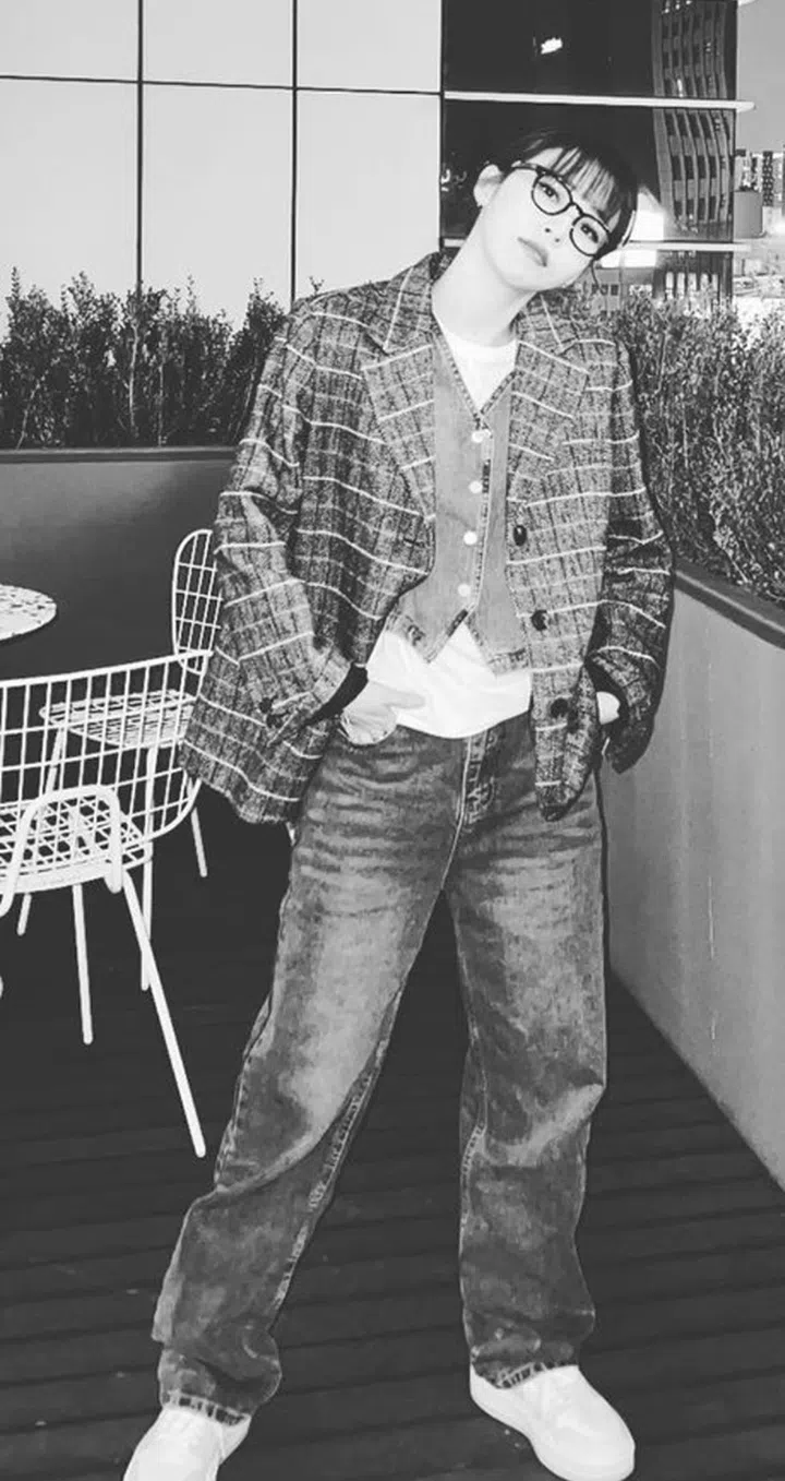 玟星中性打扮的3件式套装:T恤、牛仔马甲、格纹西装外套,借鉴了男性穿搭的酷帅个性。值得嘉奖的是,牛仔马甲与格纹西装外套,在材质上更碰撞出不羁的时尚态度与品味。