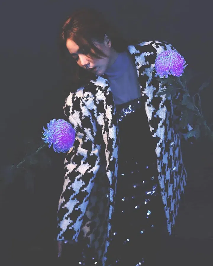 瑞恩以黑白花呢西装外套内搭透视高领上衣,再搭配亮片连身裙,别具一格的材质混搭充满极端对比,同时营造出有趣的视觉效果。