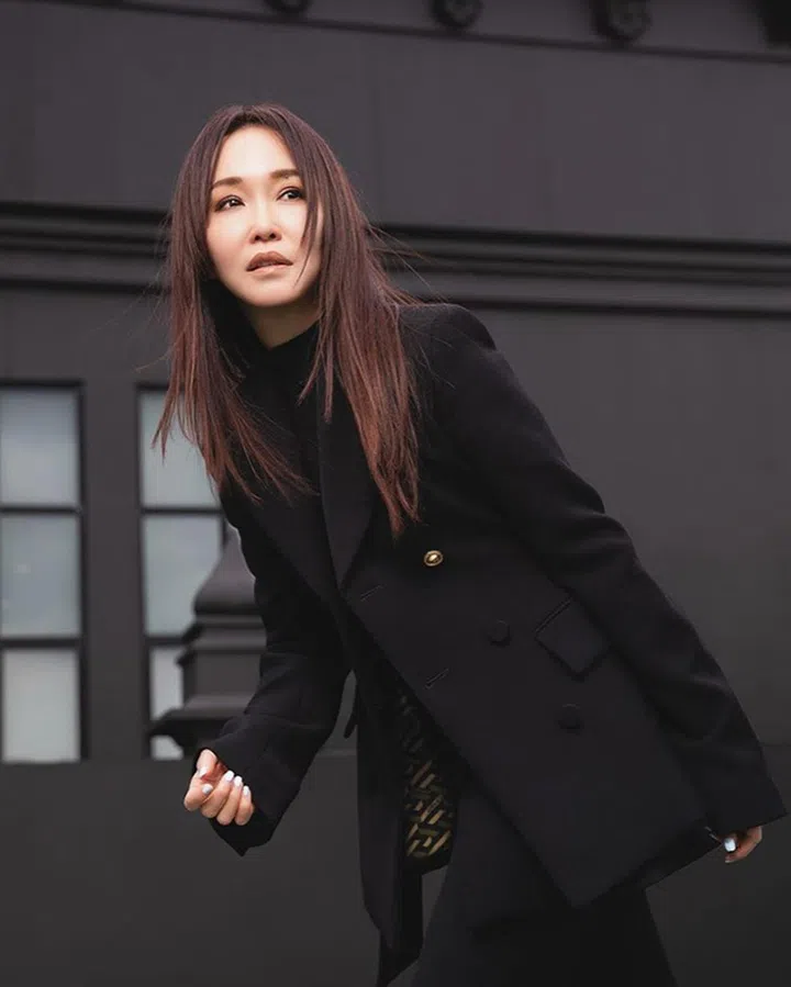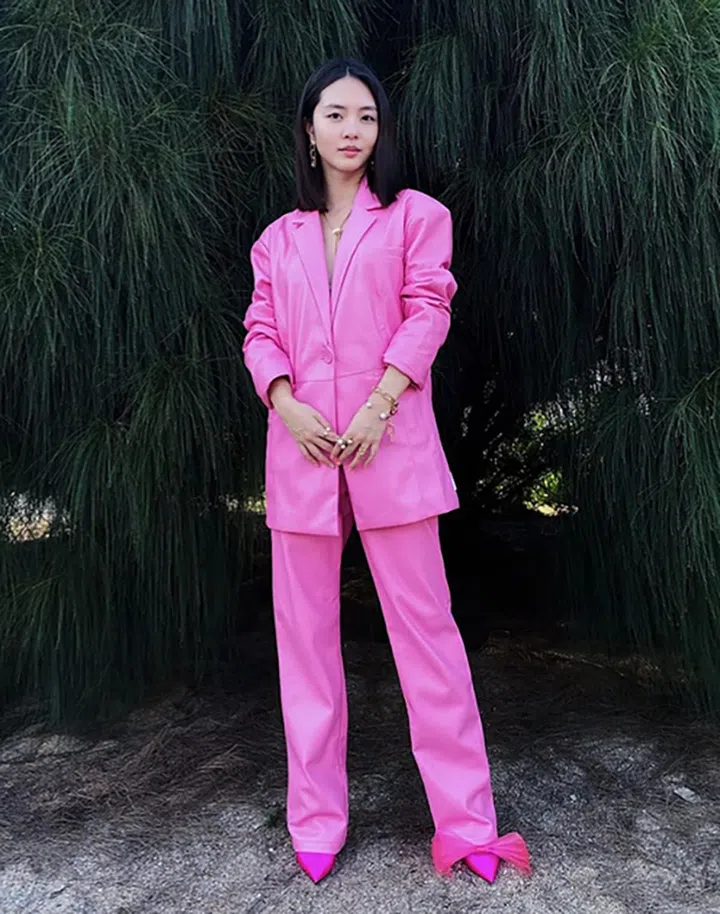 黄喧婷从头到脚穿上俏丽的粉红色,以一体同色系的西装穿搭散发出芭比娃娃般的精致感。