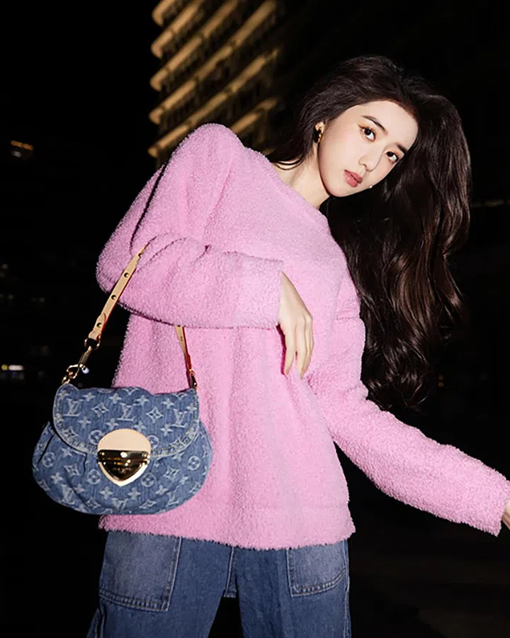 总体来说,粉色调的毛绒单品总能给人一种纯真的少女感,比如泰迪绒、剪羊毛或毛巾绒等等。李凯馨再搭配来自Louis Vuitton的Sunset牛仔肩袋,让造型散发自然松弛的时尚气质。