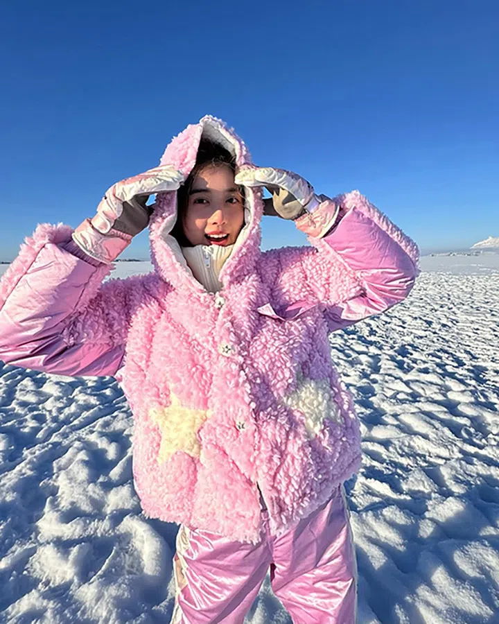 这款假两件式粉色羽绒服(来自中国品牌Le Fame),正面装饰星形图案,纽扣上也有闪亮的星星细节。下次出国旅行,不用再局限于从运动旅行品牌选购冬衣哦。