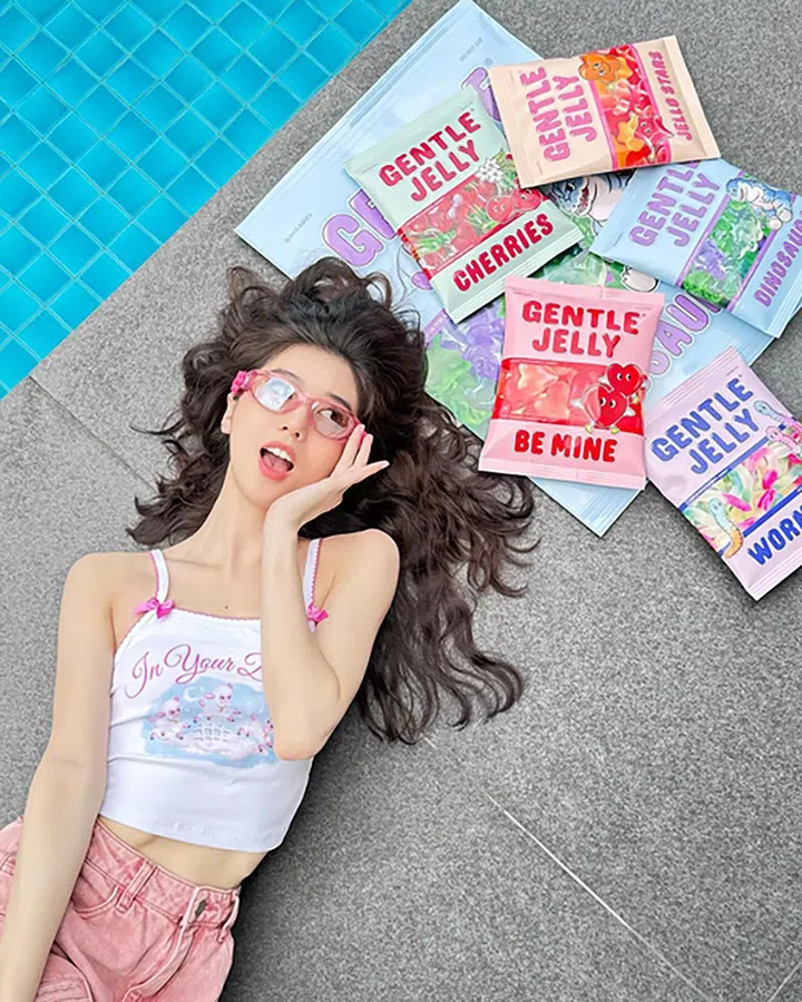 早前Gentle Monster推出Gentle Jelly系列,将果冻元素运用到墨镜上。李凯馨佩戴造型立体的粉色款墨镜,搭配来自Sugar Thrillz的卡通小羊吊带和一款粉色牛仔裤,造型高甜,元气满满。