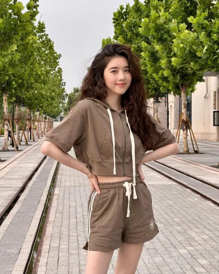 套装绝对是出游时便捷又时尚的选择。像李凯馨一样,选穿褐色短款短袖卫衣以及同款短裤,轻松地展现元气可爱的青春感!