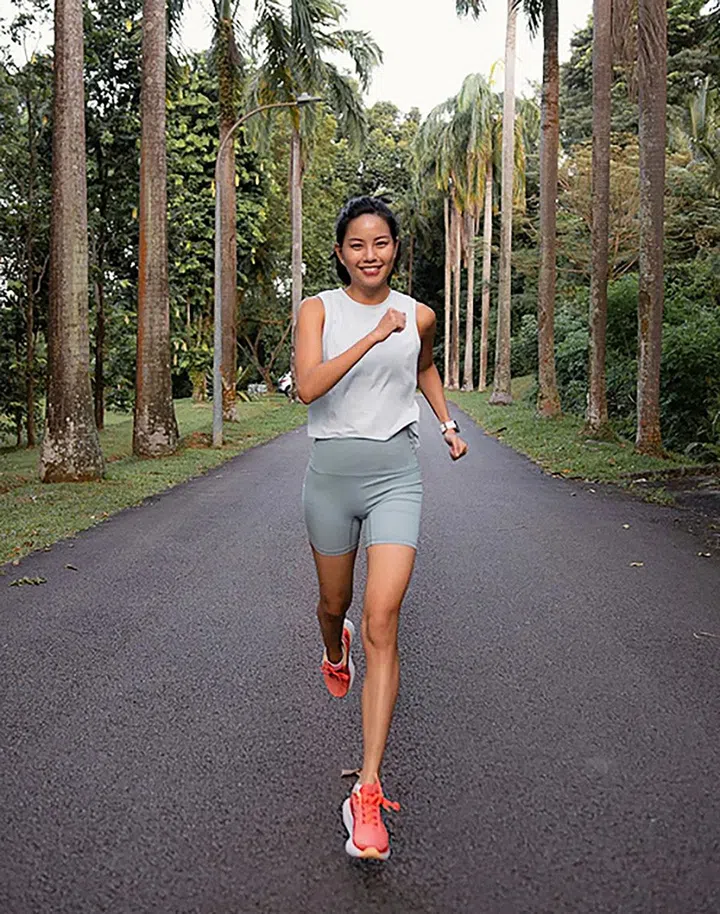 罗美仪身穿本地品牌Esse Active的灰色运动套装。其中,这款运动裤跳脱了惯常贴身、显示身材曲线的设计,整体较为宽松舒适,而宽大的腰带设计制造出腿长的效果。容易害羞、或是走低调简约风格的女友们,不妨考虑这样剪裁的运动裤哦~