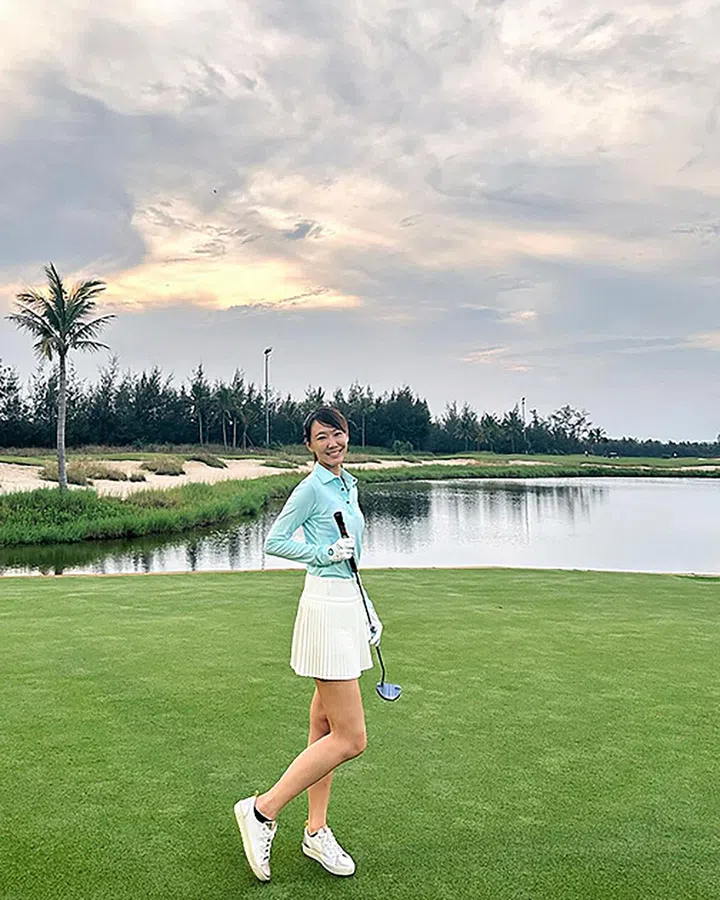 陈欣淇也是刚“入坑”高尔夫球的本地明星之一!Turquoise色的上衣+白色百褶裙,衬托出陈欣淇甜美可人的气质;不打高尔夫球也没关系,尝试穿不同颜色的运动衣服,说不定会意料外的收获噢!