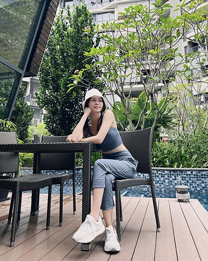 罗美仪身穿本地品牌Esse Active的灰色运动套装。其中,这款运动裤跳脱了惯常贴身、显示身材曲线的设计,整体较为宽松舒适,而宽大的腰带设计制造出腿长的效果。容易害羞、或是走低调简约风格的女友们,不妨考虑这样剪裁的运动裤哦~