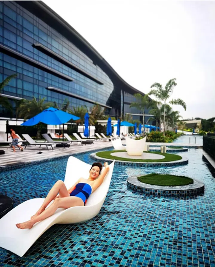 本地阿姐郑惠玉入住去年新开业的度假村酒店Dusit Thani Laguna Singapore,在泳池边享受日光浴。保养得宜的阿姐穿上一件式泳衣,和三点式泳装的效果一样火辣辣,撞色效果凸显身段曲线,也充满了活泼缤纷的度假氛围。