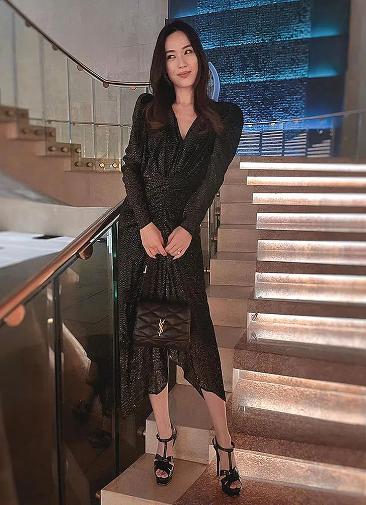 出席婚礼或宴席穿着的LBD,未必要剪裁贴身,一板一眼。学Rebecca穿上一件带褶饰的轻薄小黑裙,面料熠熠发光,造型现代、行动方便,但又不失华贵气场。