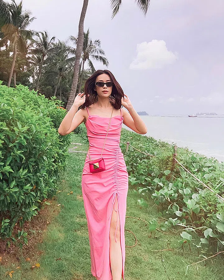 Rebecca以粉色吊带连衣裙搭配Valentino One Stud迷你包,其连衣裙的高开衩设计优雅地秀出美腿。巧妙的褶饰元素及剪裁还能起到收腰、塑身的视觉效果,让身材线条更加窈窕。