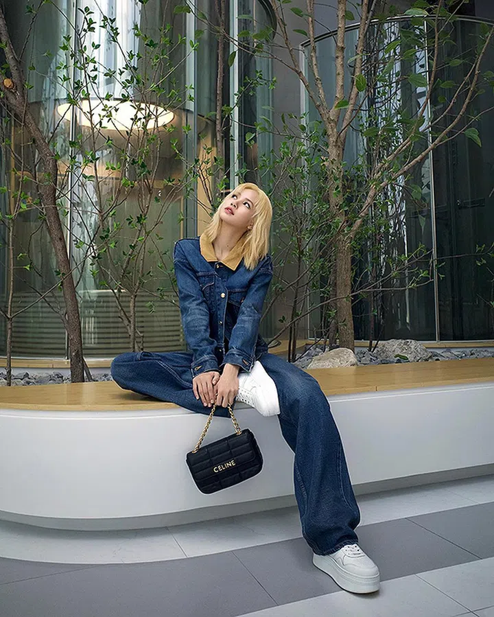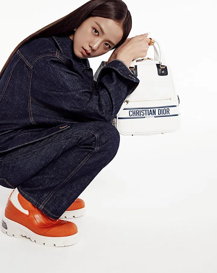 身为Dior品牌大使的Jisoo,穿着一身帅气的牛仔衬衫搭配同款牛仔裤,再利用亮眼的橘色运动风靴子为造型画龙点睛。她手里拎着的是Dior Vibe手袋,整体显得充满活力与动感。