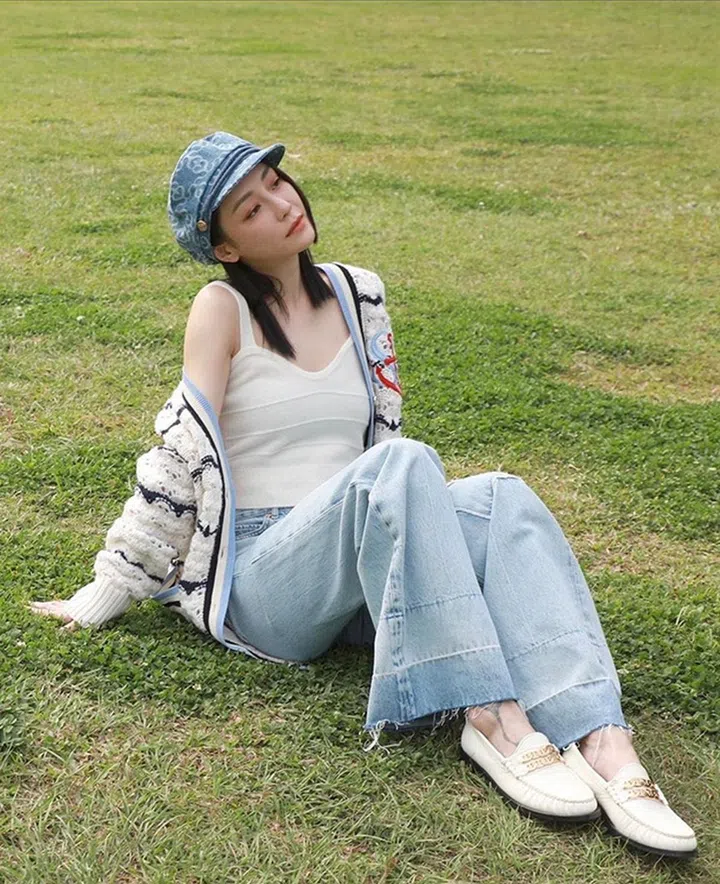女明星爱的不只是牛仔裤!谢欣颖的牛仔报童帽,与身上的宽腿牛仔裤相呼应。身上的“蓝白”效应,仿佛施展了春天的“魔法”,显得好不青春与浪漫。