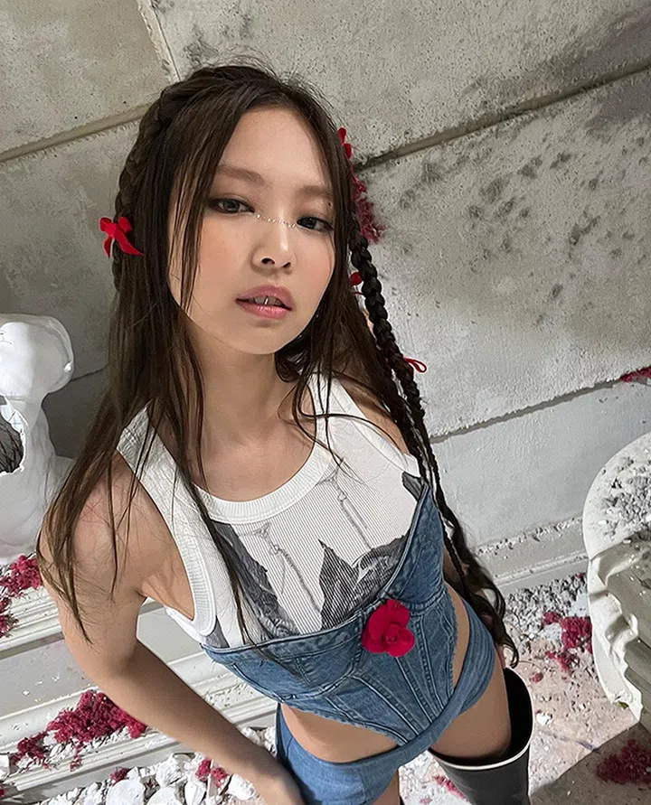 Jennie穿着Juun.J的cut-out露腰设计短裤套装及604service印花背心(剪短)搭Chanel长靴,服装上的红色元素与发饰呼应,造型俏皮又热辣。