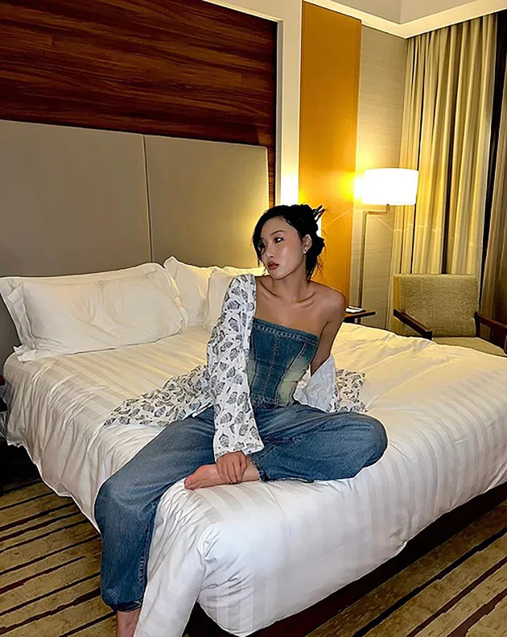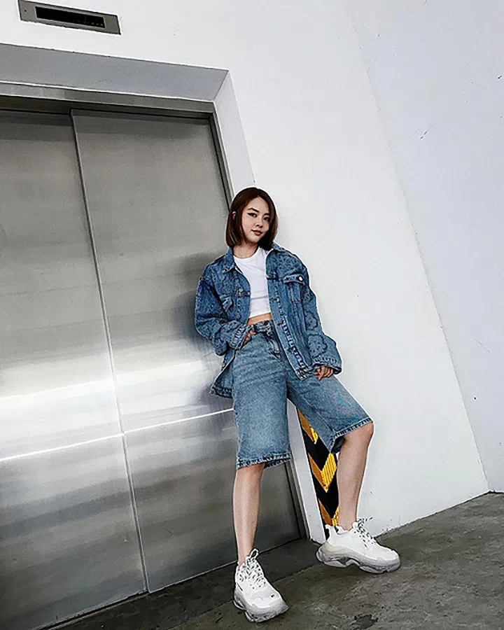 如果觉得牛仔外套太厚重,在本地穿太闷热,那不如参考黄思恬这身Alexander McQueen套装的打扮。以短版牛仔上衣搭配牛仔长裙,展露出自身的“腰”精魅力。
