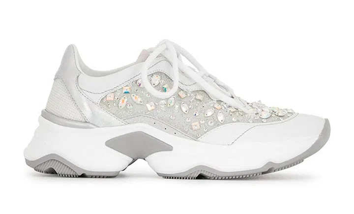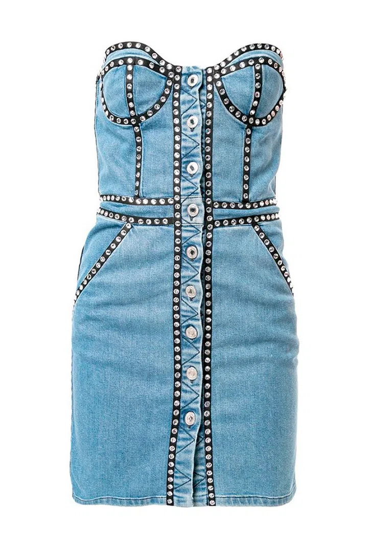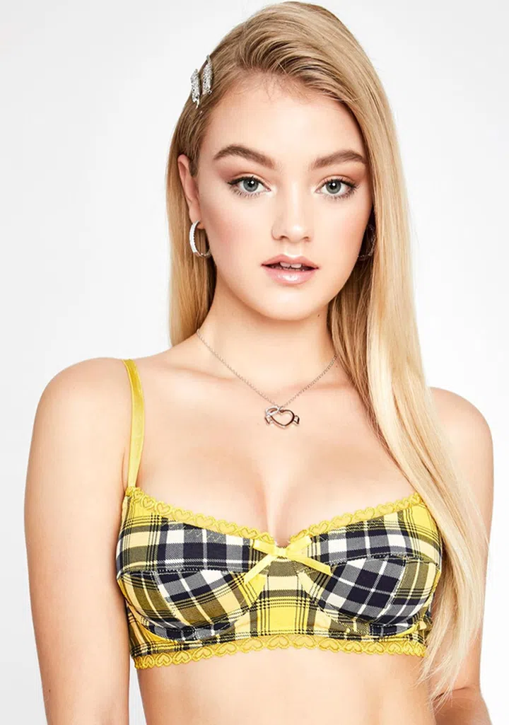 这身幽默俏皮的云朵印花套装,是由dELiA*s by Dolls Kill的印花连衣裙短外套套装修改而成的。将连衣裙从腰部剪开变成裙子,再将裙子的下摆卷起,营造出有趣的蓬松廓形。内搭来自Sugar Thrillz的显眼黄色格纹印花内衣,佩戴可爱腰链,而脚上的Gucci水晶缀饰运动鞋更令造型既甜美又不失性感度。