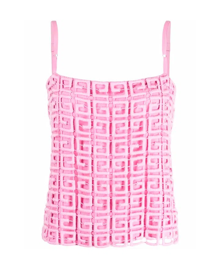 全粉红色的一幕再次回归,但泫雅和DAWN金晓钟的造型却换了。顶着一头大绒毛帽的泫雅身穿标志性印花,是Givenchy的4G凸花吊带背心上衣改制而成的短上衣。脚上穿着Alexander McQueen厚底帆布鞋,清新有朝气。