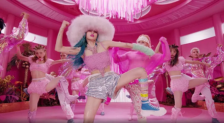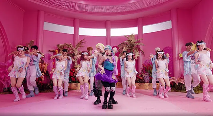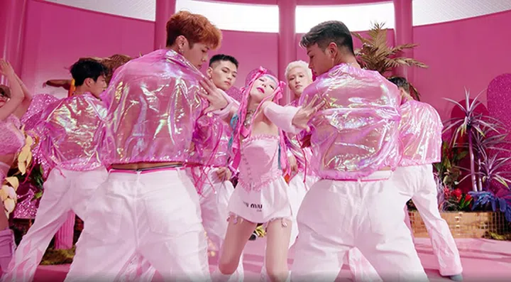 影片开场舞蹈中,泫雅在猛男群中“浮出”,画面里的粉色萌度爆棚。那眼熟的Miu Miu logo,在泫雅“裙”上显而易见。