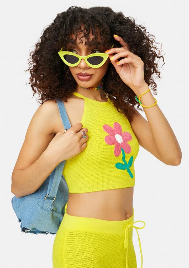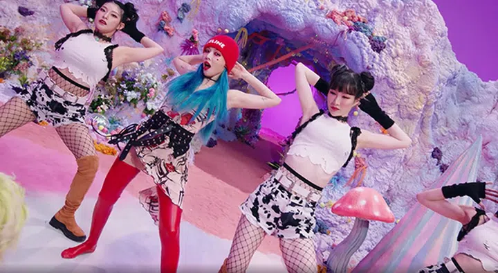下一幕,泫雅和DAWN金晓钟穿上了近期很流行的潮流针织look。可爱抢眼的黄色针织吊带短上衣来自dELiA*s by Dolls Kill,一个以“IDGAF”精神为宗旨的网络时尚潮店。脚上的同款“高筒袜”,是由一件针织休闲长裤改制而成。内搭性感火辣的紫色透视蕾丝连体衣,佩戴可爱草莓耳坠与整体的黄色形成完美的颜色对比。