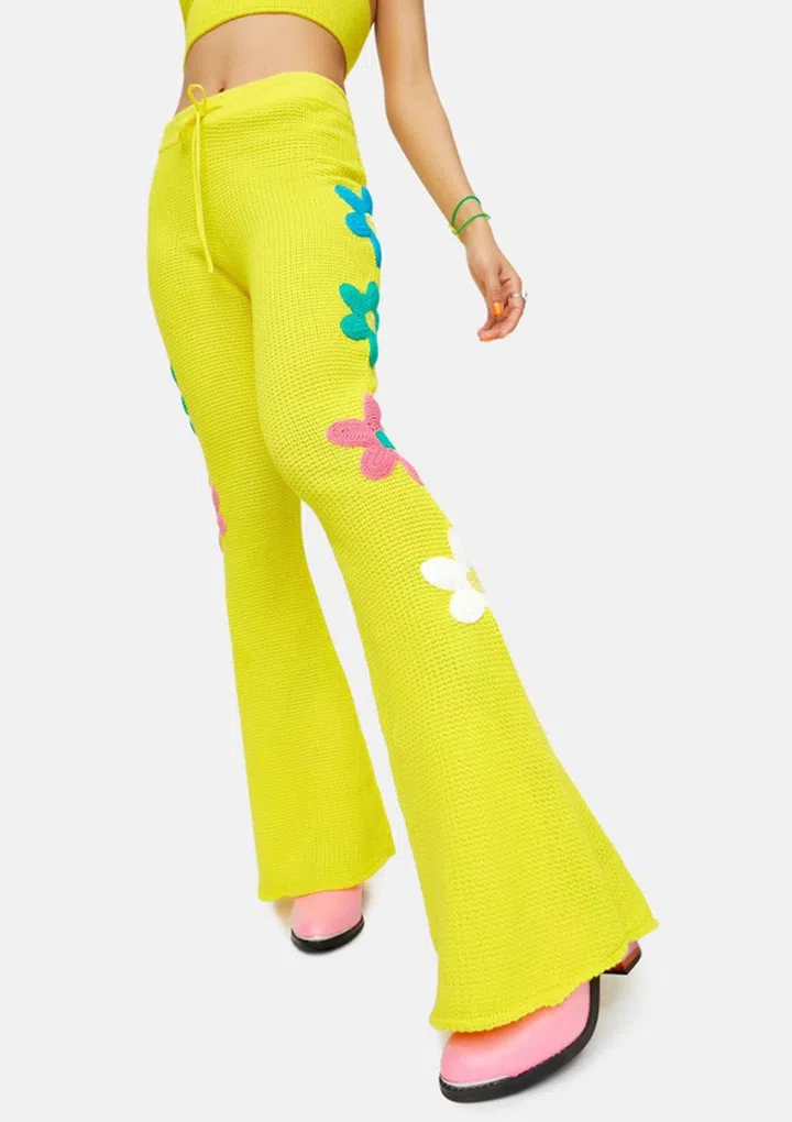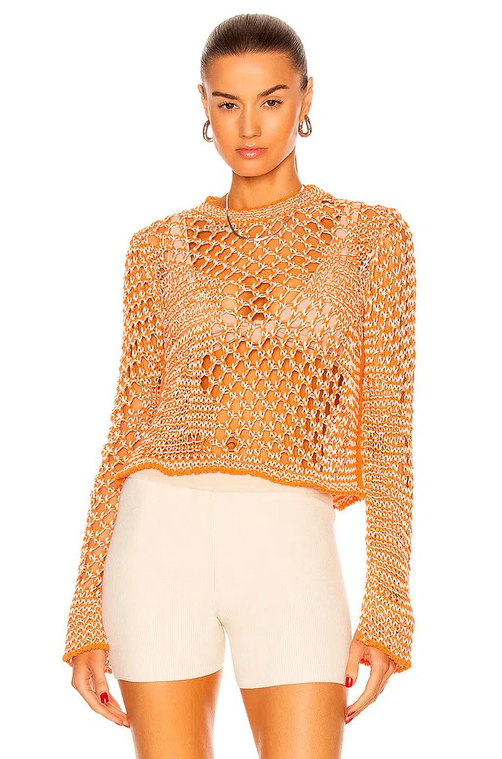 与泫雅配合,DAWN金晓钟身穿来自Acne Studios的渔网式针织毛衣黄色长裤。