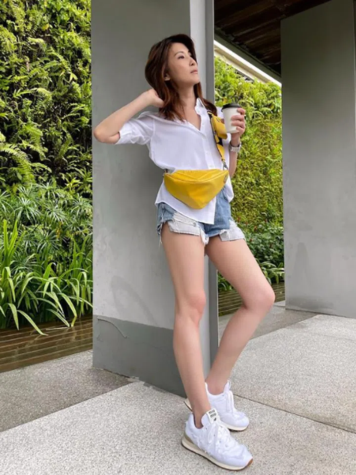 想结合时尚感和舒适度?像欧萱一样以白色衬衫配搭牛仔短裤,再善用色彩鲜明的小单品,例如她所携带的亮黄色斜挎包,不仅轻松解放双手,同时为简约造型增添色彩焦点。