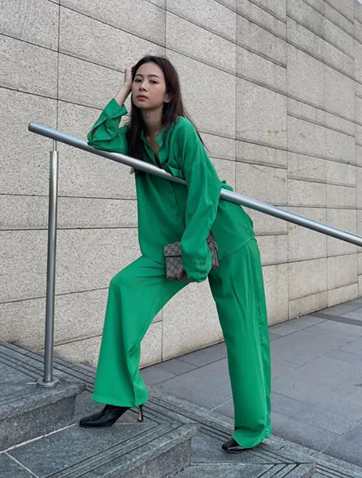 《女友》提及“清一色”造型是今季的一大趋势。罗美仪穿上廓形宽松的同色系衬衫与长裤,搭配犀利的黑色高跟鞋和Gucci手袋,展现出随性帅性的时尚感。