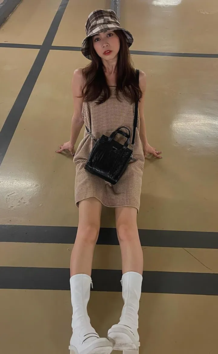 两种不同的格纹搭配在一起,竟然能如此顺眼。身穿千鸟格纹连衣裙的罗美仪,利用苏格兰格纹渔夫帽呼应造型,白色的高筒靴与Balenciaga肩袋的搭配,更是将造型注入了独特的街头风,