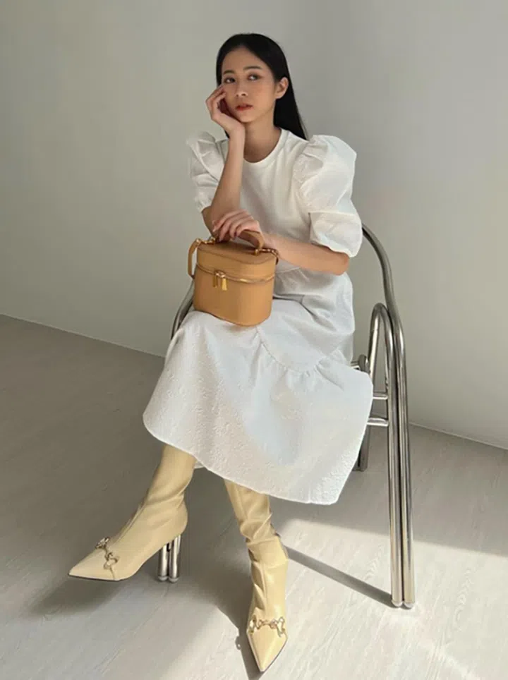 一袭白色有型的连衣裙穿在罗美仪身上,即典雅又时尚。搭配上个性尖头高筒靴,以及温柔棕色Bonia Bria包, 整体风格散发着女人魅力。