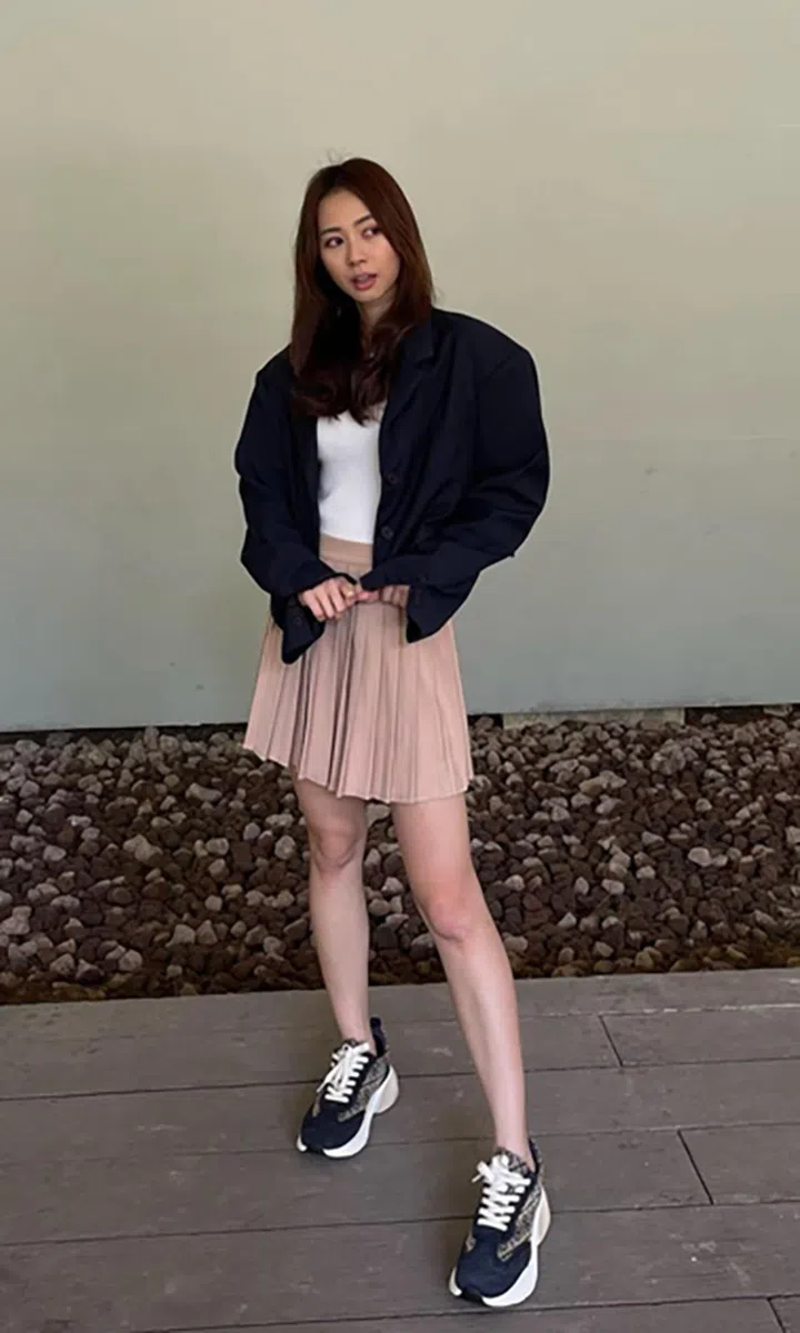 舒服自在的衣服也可以很时尚。罗美仪穿上Onitsuka Tiger连帽衫套装,头戴棒球帽,再拎了个Charles & Keith手袋,整体看起来自在无拘束。