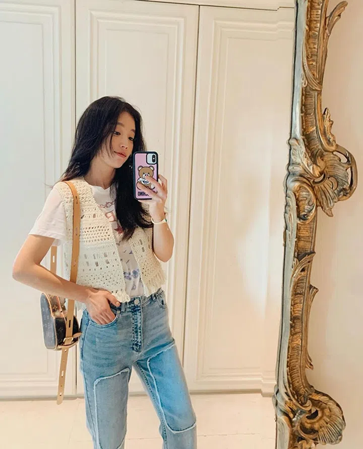 只要选对颜色,钩织衫也可以很阳光哦!参考孔孝真的休闲穿搭,亮眼的粉鹅黄色钩织衫配牛仔裤,轻松穿出清新文艺气息。