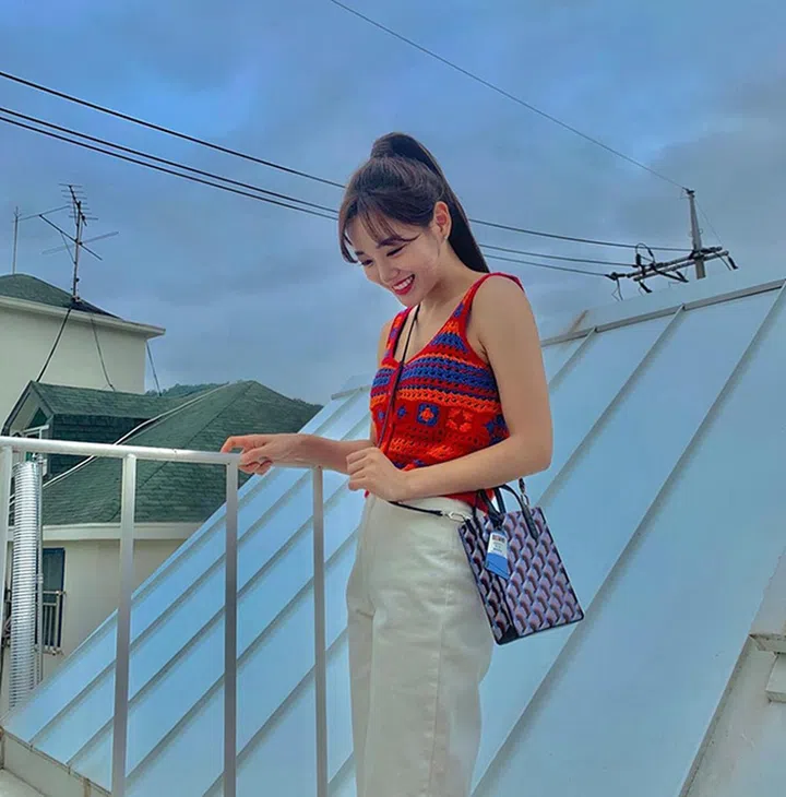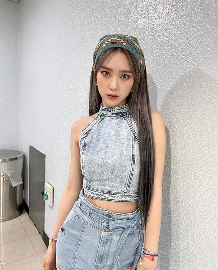 除了钩织帽,还有钩织小方巾发饰。Oh My Girl成员Jiho一身个性牛仔单品穿搭,在头上系了钩织小方巾,温柔与率性碰撞,化身甜酷女孩。