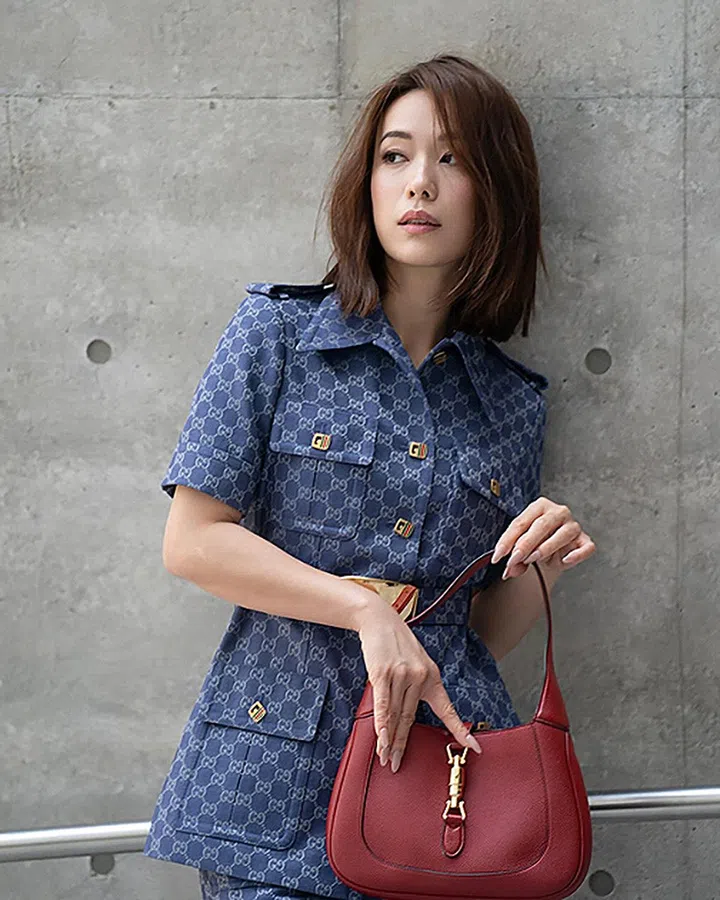 布满GG monogram的Gucci短袖夹克,硬朗有型的材质配合高腰腰带塑出身形,搭配红色Gucci Jackie 1961手提斜挎袋,造型休闲又帅气。