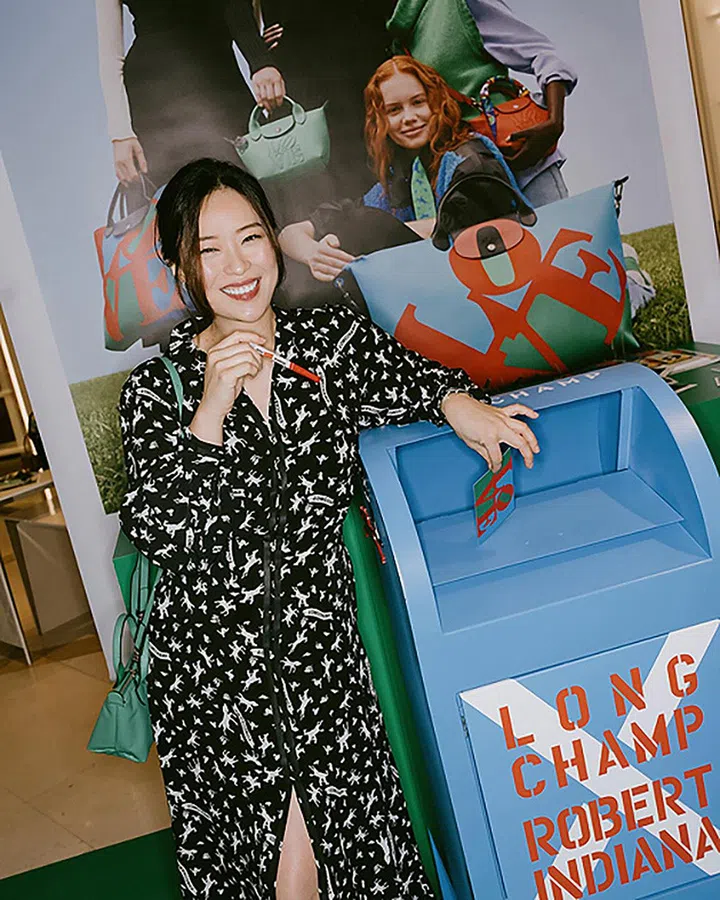 这身黑色Longchamp连衣裙,上面装饰俏皮图案,给人一种轻松活泼的感觉,非常适合休闲场合穿着。她所搭配的这款包包,和11月寿星陈楚寰的那款手袋均来自Longchamp x Robert Indiana系列(向已故美国艺术家Robert Indiana的标志性作品致敬)。