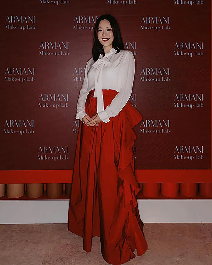 10月在Armani美妆活动上的惊艳红色造型。这身搭配采用了大胆的撞色组合,白色上衣与鲜艳的红色长裙营造出强烈的对比效果。对于孕妇来说,这样的颜色组合不仅可以提升整体造型的活力感,还能在视觉上产生聚焦,分散人们对身形变化的注意力。