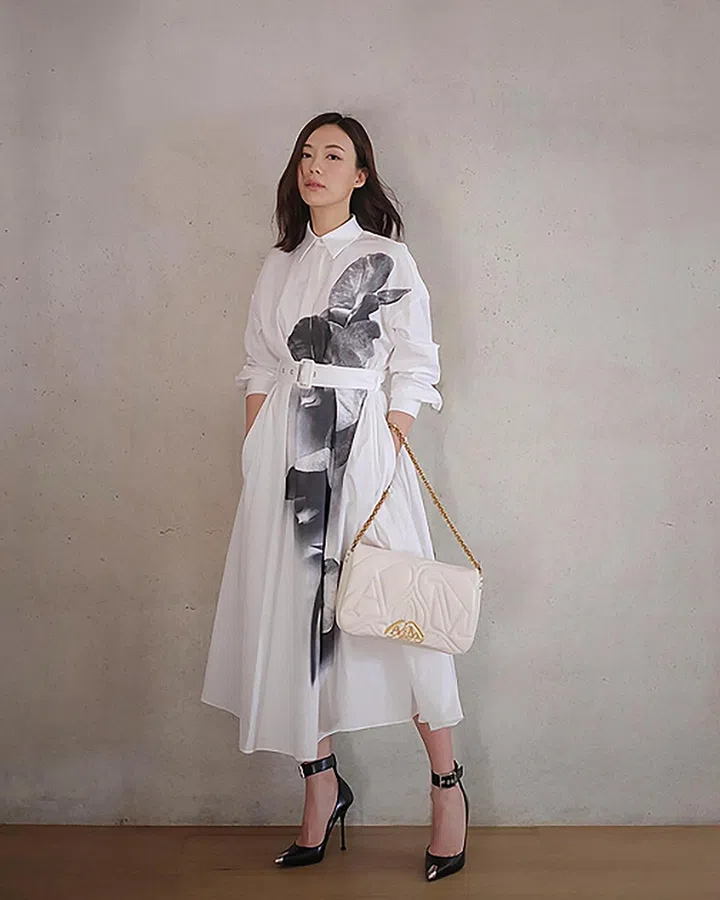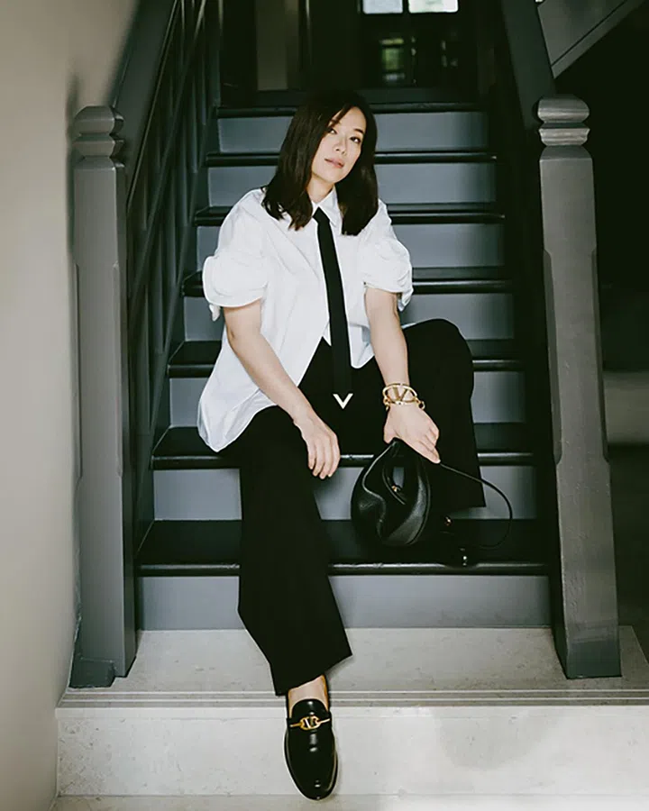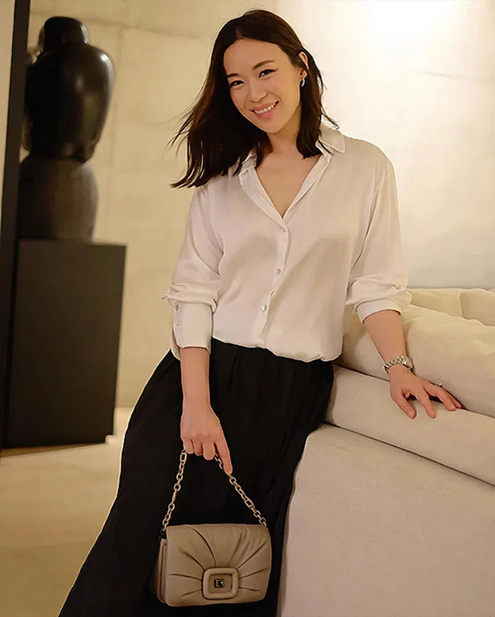 宽松丝滑的白衬衫,也是女神必备的松弛感核心单品。不仅韩星常常在发布会或韩剧里穿着,它的日常实穿性也很强。搭配一款气质包包,如林慧玲手中Roger Vivier的Viv’ Choc手袋,为整体造型增添精致感。