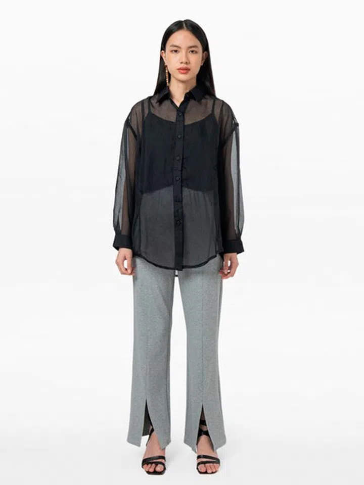 就是要让热衷于黑色的你并不孤单。除了平时的黑衬衫,不如尝试换上这件自带层次感的透视衬衫,里面有黑色背心打底,在office也不会太过性感。