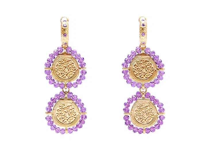 以古金币为灵感的金色耳坠巧妙地结合紫色的仿制水晶石,刚中带柔地为佩戴者添加一丝youthful的感觉。