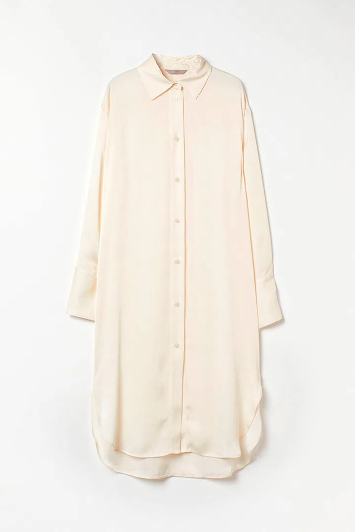 这缎面大廓形衬衫裙有点类似在家穿着的睡衣廓形,可是却又不失体面,其实非常实穿。值得留意的是,这是使用至少50%可持续材料或环保布料的H&M Conscious系列产品,时尚与环保意识兼顾。