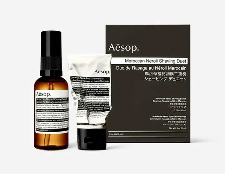 这个组合包含Moroccan Neroli Shaving Serum精华和MoroccanNeroli Post-Shave乳液。前者是拥有低泡沫剃须精华,配方含有芦荟和泛醇,可让剃须刀轻松划过,减少对皮肤的摩擦。后者则是以橙花,檀香和红没药醇混合物所制成,可有效舒缓剃须刀对皮肤的损伤。