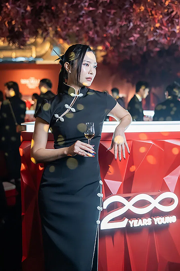 黄晶玲大胆选择中式旗袍,以东方元素演绎神秘魅惑造型——跟现场的红色背景也格外相衬。