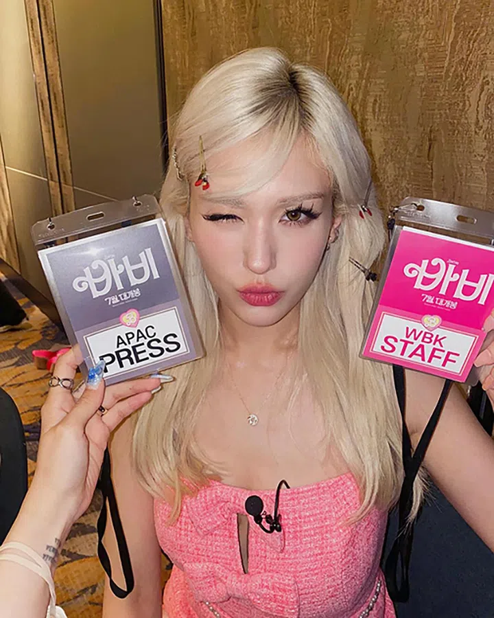 Somi以粉色花呢造型搭配金发,堪称亚洲真人版芭比。另外,Somi的迷你专辑《GAME PLAN》主打曲《Fast Forward》MV预告释出(8月7日数位率先发行),在公开的海报中,Somi也如“机车芭比”般甜酷。