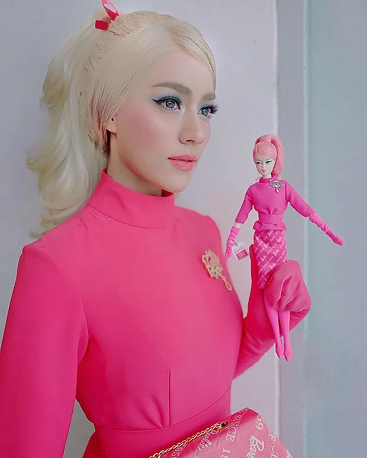 泰国女星Kimberley Anne Woltemas穿着芭比粉造型,妆容精致和手中的Barbie几乎一模一样。另外,《芭比》电影的服装组也是参考了大量原版Barbie后进行的设计,除此以外,服装大多来自Chanel。电影从Chanel archive借来了大量套装、沙滩及配饰,Chanel设计总监Virginie Viard还为Margot Robbie饰演的Barbie打造了多套戏服,同时为Ryan Gosling饰演的Ken设计了一套滑雪装。