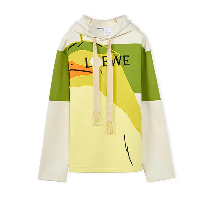 这款设计宽松的棉质摇粒绒连帽衫(为了尽展布料工艺效果,衣服多选松身设计),正面饰有轮廓刺绣的 Otori-Sama 嵌花图案和LOEWE标记刺绣,造型考究又具幽默感。