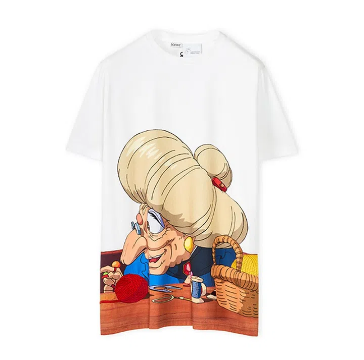 这款棉质圆领T恤,饰有带3D刺绣和饰珠的Zeniba印花(她是汤婆婆的双胞胎姐姐钱婆婆,尽管在人物造型上和汤婆婆基本没有区别,性格上却有很大反差)。另外,系列还有将各种动画场景变成整幅印花的抢眼单品,根本回忆杀!