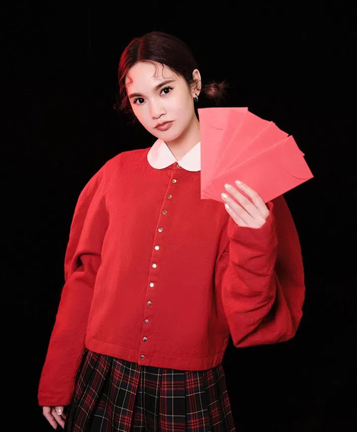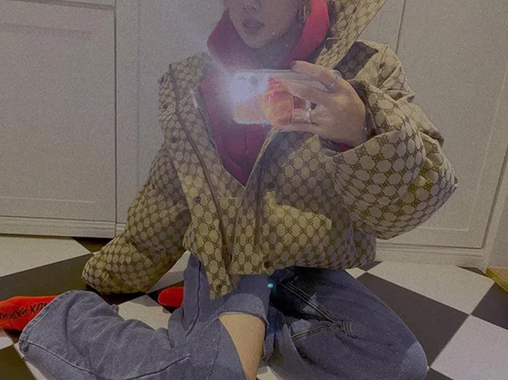 吴映洁穿上Gucci与Balenciaga联手推出的The Hacker Project经典印花羽绒服,搭配红色喜庆的连帽衫、袜子,以及破洞细节牛仔长裤,诠释出叛逆街头风。