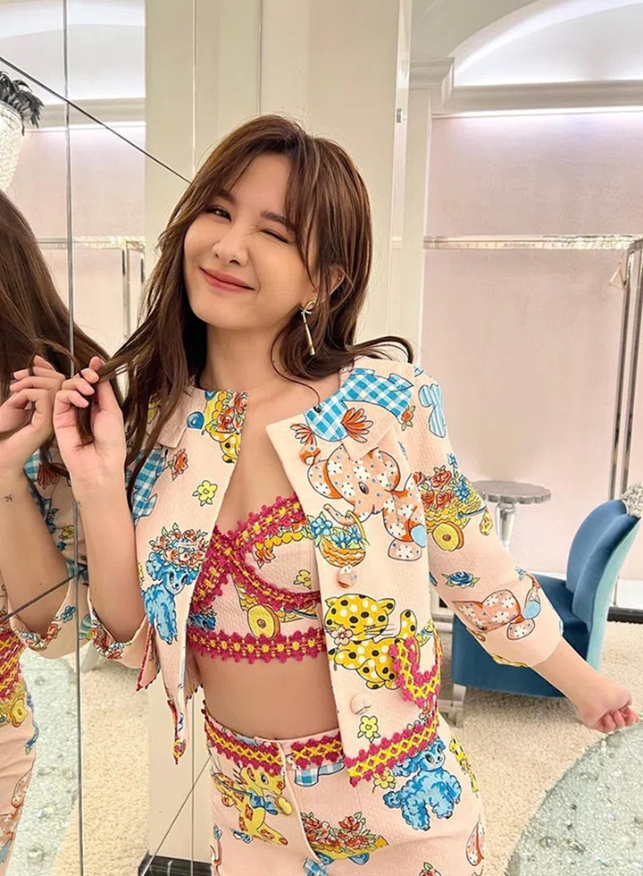杨丞琳穿上少女风格的彼得潘领宽版上衣,搭配百褶短裙,青春洋溢地给粉丝们拜年。