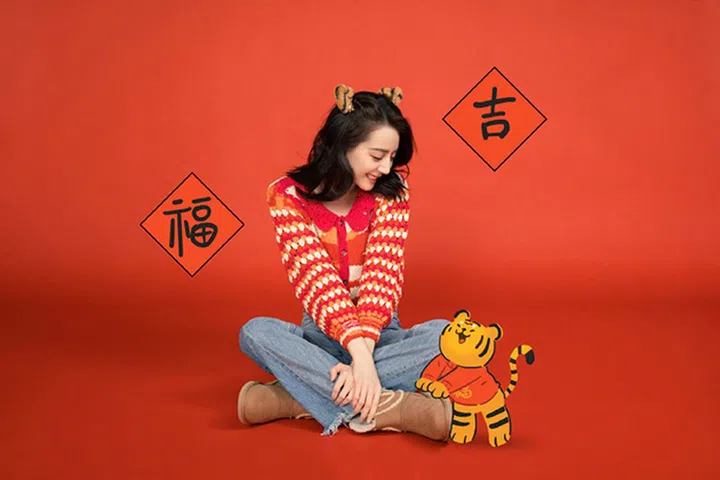 迪丽热巴俏皮虎“上身”,穿上靓丽多彩钩针衫搭配牛仔长裤,再以棕色保暖靴和可爱的老虎耳头饰完装。这只魅力无敌的“最美丽小老虎”给大家拜年咯!