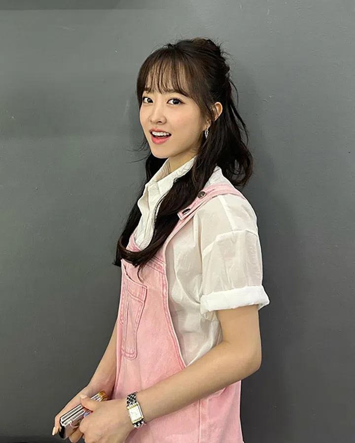 说到甜美造型,怎么能少得了可爱又活泼的背带裤单品呢?来看娃娃脸“国民妹妹”朴宝英示范 —— 她一改平日常见的深色、牛仔色的背带裤,选穿了一件粉色的背带裤,更显青春活力!