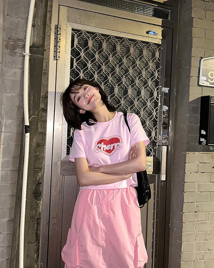 全粉色的造型也可以搭配出层次感哦!且看李瑜美的另一示范:浅粉色的T-Shirt配上亮粉色的长款工装裙子,可爱又休闲~