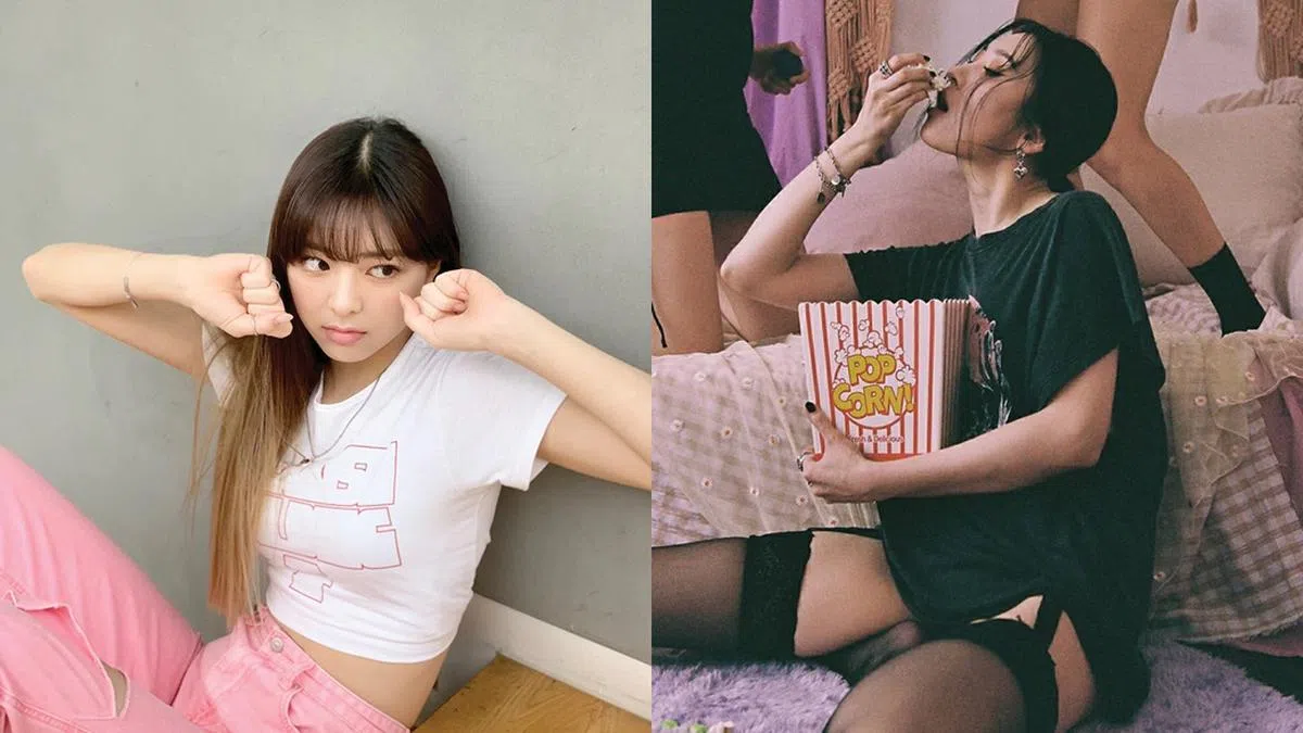 韩星宣美(Sunmi)Instagram新照,以超性感黑色吊袜带搭配深色T-shirt,连吃爆米花都能吃得这么燃!想挑战这种超燃、性感、个性的宅家T-shirt照,不妨试试近来热度极高的内衣搭配法。可穿吊带袜、网袜(及膝袜也可)+T-shirt,或者将透明蕾丝corset穿在T-shirt外。
