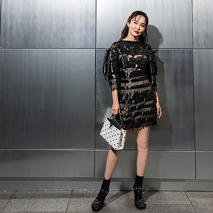 在穿着连衣裙、铅笔裙,以及短靴、短袜时,由于双腿露出面积减少,可以选择镂空、裸色细节或者带透视效果的裙装,不仅在视觉上进行“补偿”,也能给人更加轻盈、灵动的感受。
